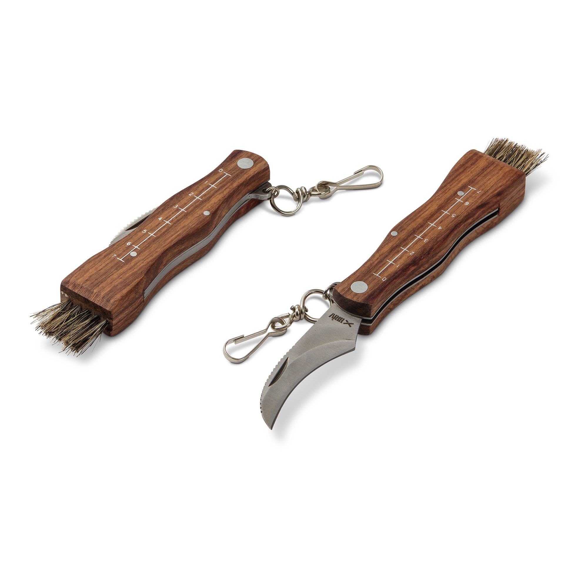 Svampkniv med vikbart knivblad och handtag i trä. Kniven är försedd med borste som effektivt avlägsnar jord och annat skräp från svampen. Nu med mätskala på ena sidan. Knivbladet är mycket vasst och kniven bör därför förvaras utom räckhåll för barn.