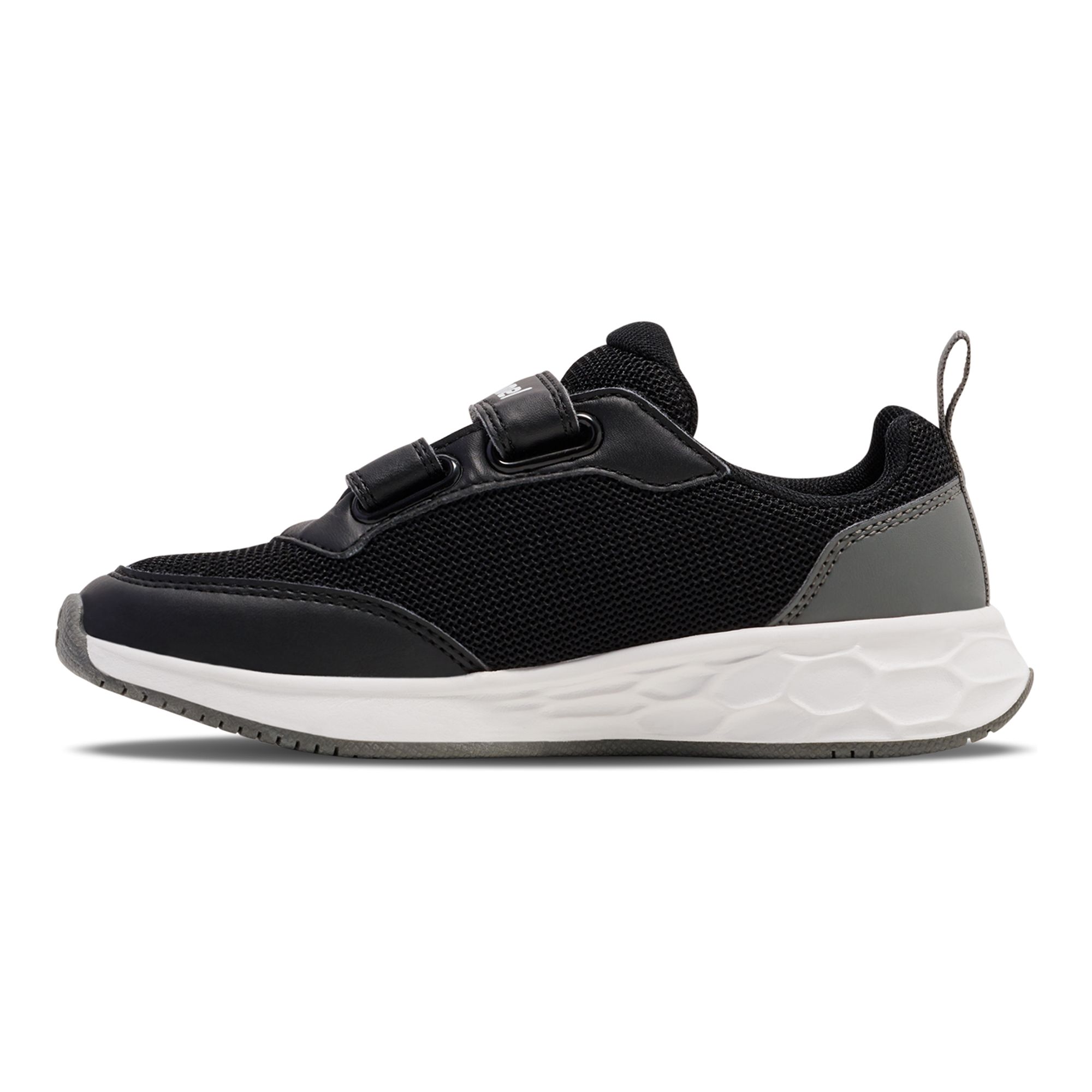 Ovandel i mesh som är luftig och håller fötterna torra. Förstärkt tåbox för att motstå slitage. Stötdämpande material i mellansulan. Non-marking-sula som inte lämnar märken i golvet. Skorna stängs med kardborreband, vilket gör det enkelt för barnet själv att ta på och av dem.